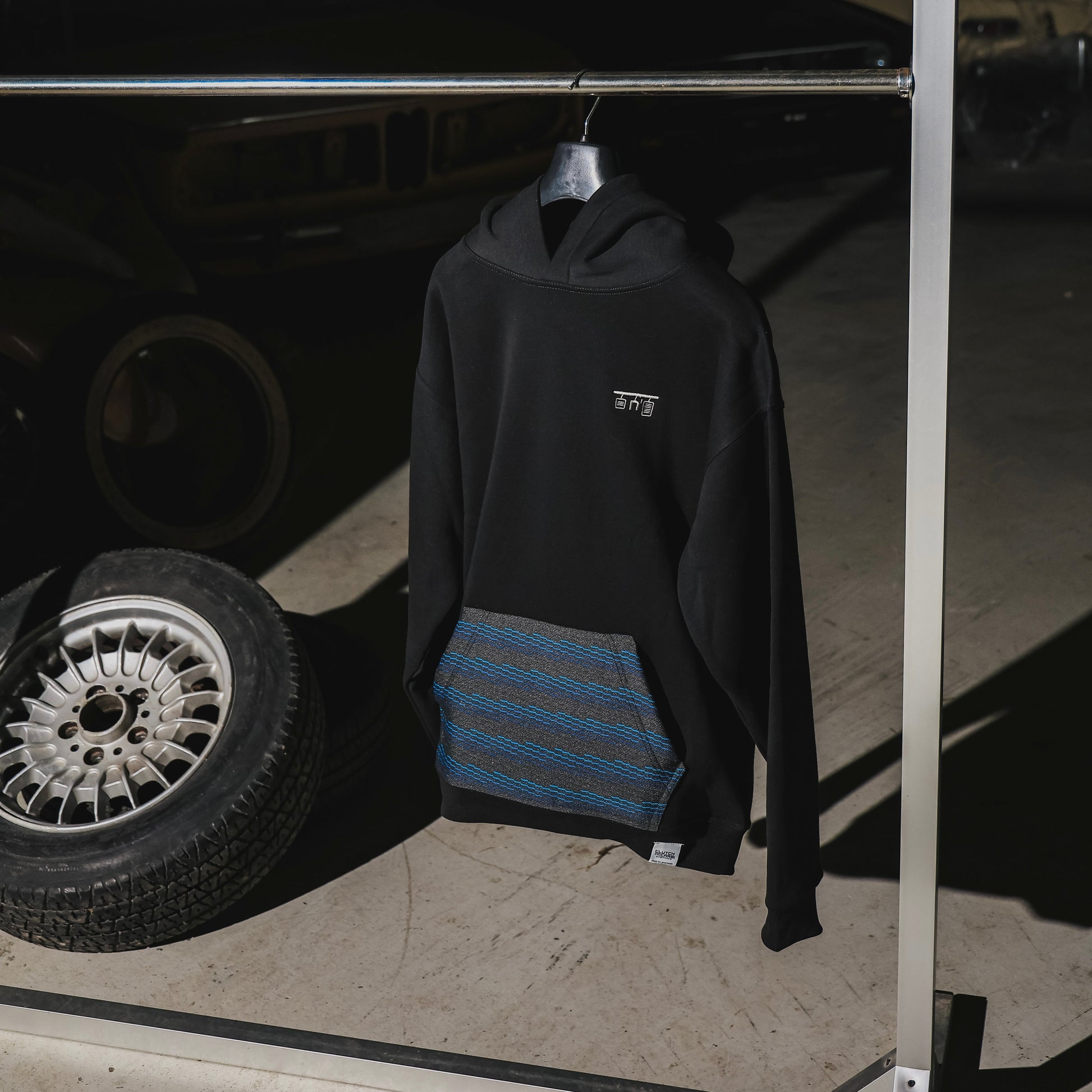 This hoodie features a one-of-a-kind neon blue pocket cut from authentic BMW M-Power interior, bringing iconic sports-car craftsmanship into everyday wear.